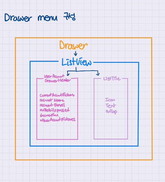 drawer ์ ๋ง๋ค๊ณ , ๊ทธ ์์ ์์ ์์ ฏ(child)์ผ๋ก ListView๋ฅผ ๋ง๋ค์ด์ค๋๋ค. ๊ทธ ์์ ์์ ฏ ์์ ๋ ๋ค๋ฅธ ํ์ ์์ ฏ(children)์ ์์ฑํด์ค๋๋ค. ListView๋ ๋๊ฐ์ง๋ก ๊ตฌ์ฑ์ด ๋ฉ๋๋ค. ์ผ๋จ Header๋ถ๋ถ์์ ๊ณ์ ์ด๋ฆ, ํ๋กํ ์ฌ์ง ๋ฑ์ ๋ฃ์ด์ฃผ๊ณ , ๋ค๋ฅธ ํ์ด์ง๋ก ๋์ด๊ฐ ์ ์๋ ๋ฉ๋ด๋ฅผ ListTile์ด๋ผ๋ ์ด๋ฆ ์๋ ์์ฑํด์ค๋๋ค ListTile๊ตฌ์ฑ์ ๋ณด์๋ฉด onTap์ด ์๋๋ฐ, ์ด ๋ถ๋ถ์ ๋์ค์ ๊ฐ๋ฉด ๋ ๊น๊ฒ ๊ณต๋ถํ ์์ ์ด์ง๋ง ๊ฐ๋จํ๊ฒ onPressed์ ๋น๊ตํด๋ณด์๋ฉด onPressed๋ ์ฃผ๋ก ๋ฒํผ์ ์ฌ์ฉ์ด ๋๊ณ onTap์ ์ ์ค์ณ๊ฐ ๋ํด์ง ํด๋ฆญ ๋์์ ํํํ ๋ ์ด๋ค๊ณ ํฉ๋๋ค. ๊ธธ๊ฒ ๋๋ฅธ๋ค๊ฑฐ๋ ๋๋ฒ ํญํ๋ ๊ทธ๋ฐ ๋์! ๐