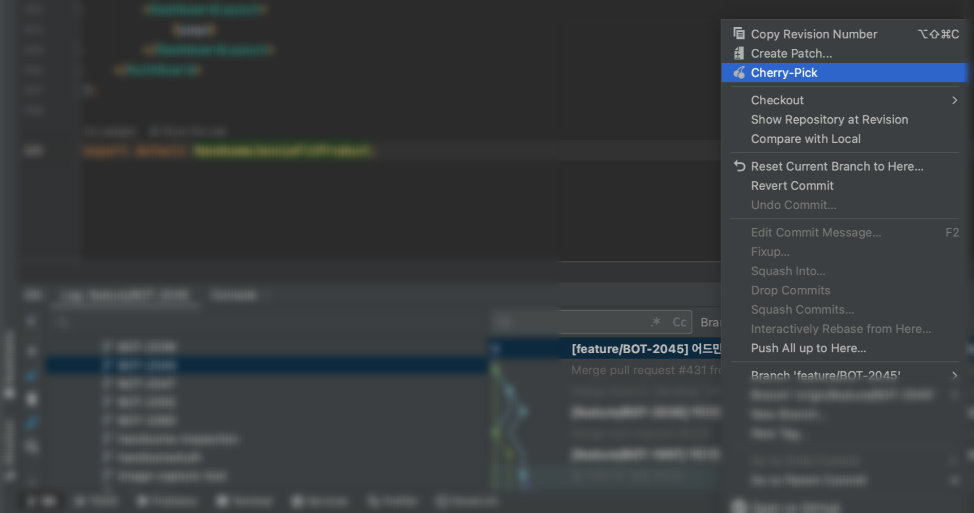 ๊ฐ์ ์ฐ๋ IDE์ ๋ณด๋ฉด git ์ด๋ผ๋ ๋ฉ๋ด๊ฐ ์์ ๊ฒ์ด๊ณ ๊ทธ ๊ณณ์์ ์ฒด๋ฆฌํฝํ๊ณ ์ถ์ ์ปค๋ฐ์ ์ ํํด์ ์ค๋ฅธ์ชฝ ํด๋ฆญ์ ํ๋ฉด~ ์ด๋ ต์ง ์๊ฒ cherrypick์ ๋ณด์ค ์ ์์ ๊ฒ์ด๋ค.