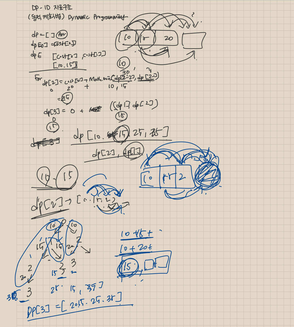 2. cost[0]์์ ์งํํ๋ค๊ณ ๋ดค์ ๋, cost[1]์์ ์งํํ๋ค๊ณ ๋ดค์ ๋ ๋๊ฐ์ง๋ฅผ ๋ฃ์ด์ค๋ค. ์ฃผ์ด์ง ๊ณ๋จ์ด length๊ฐ 2๋ฅผ ๋์ ๊ฑฐ๊ธฐ๋๋ฌธ์ ์ ๊ฒฝ์์จ๋ ๋จ