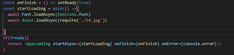 - startAsync (function) : Promise๋ฅผ ๋ฐํํ๋ ํจ์๋ฅผ ์ ๋ฌํ๋๋ฐ AppLoading์ด ์์๋ ๋ ์คํ๋๋ค.